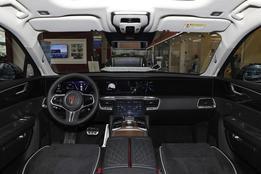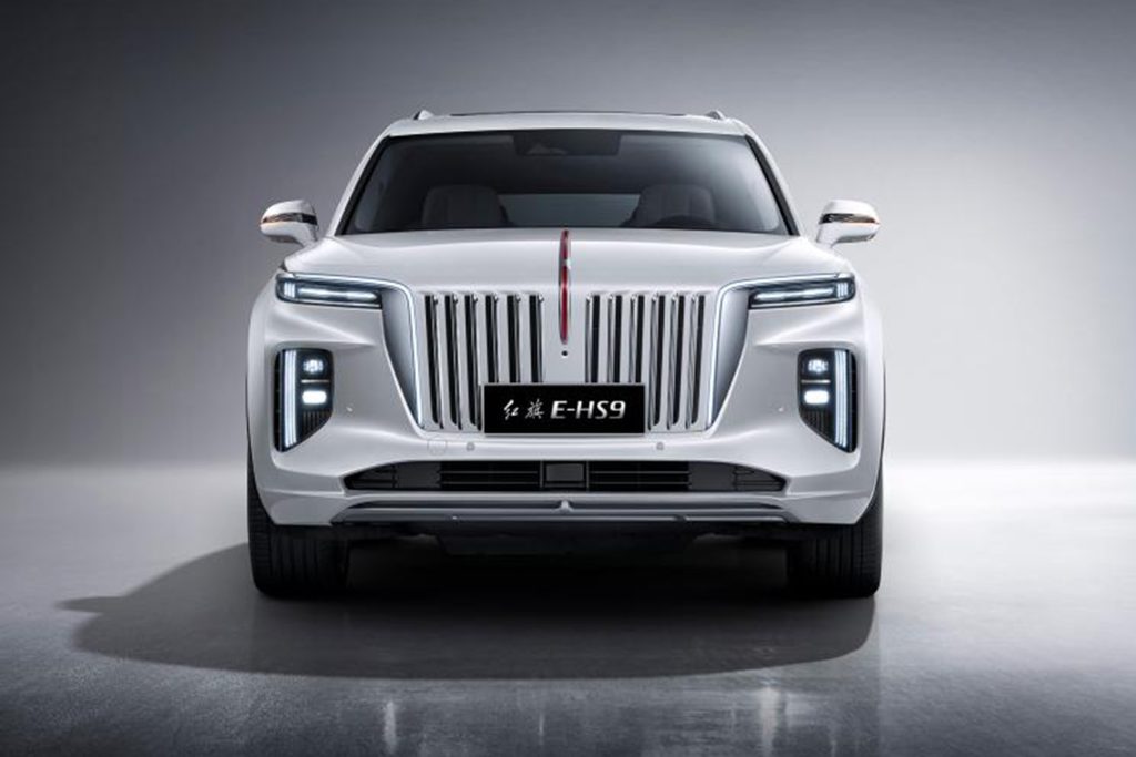 The Hongqi E-HS9 showcases a grand and imposing presence, featuring: