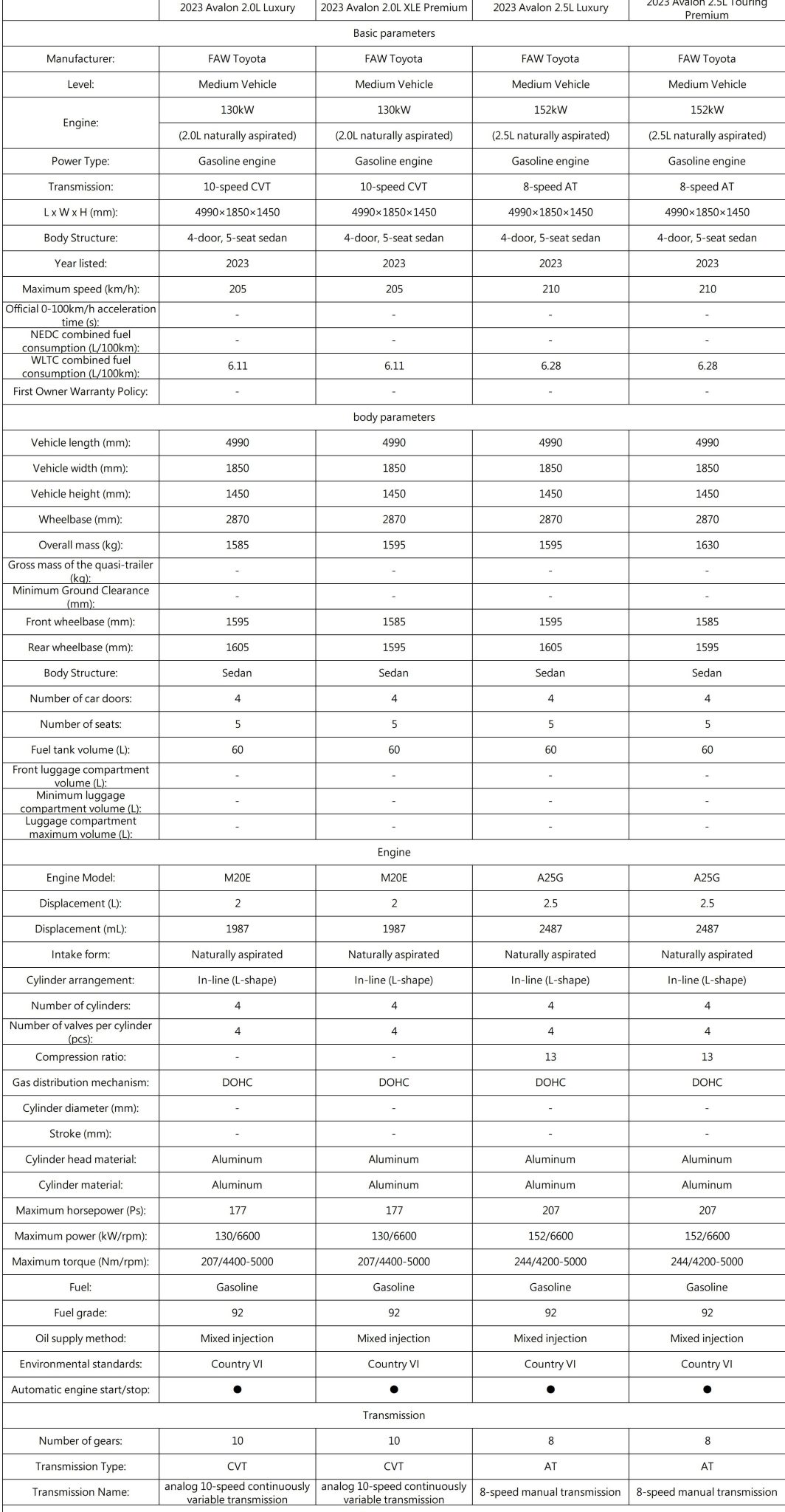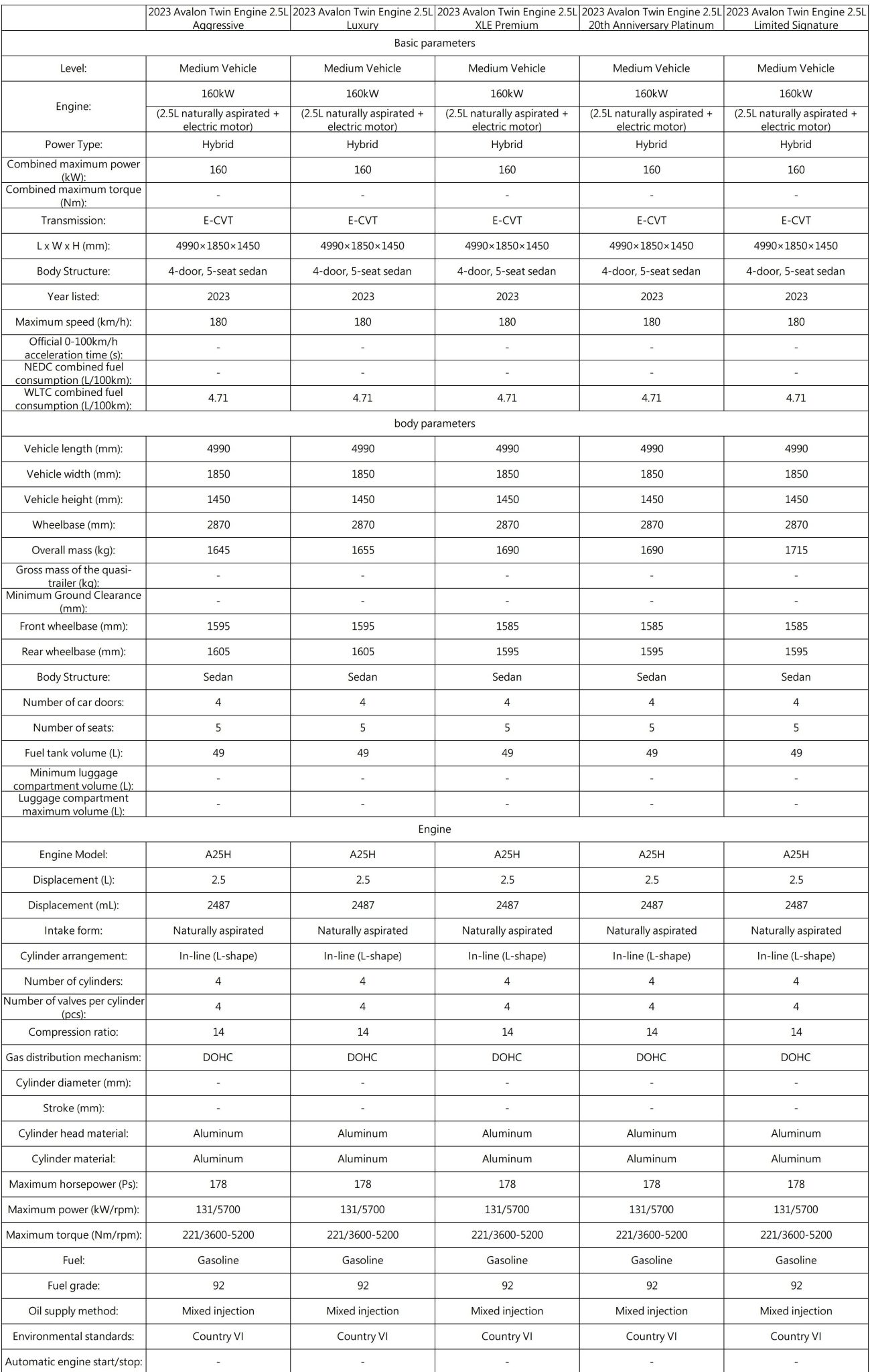- A hybrid variant (Avalon Hybrid), combining a 2.5L engine with an electric motor, offering a fuel economy as low as 4.3L/100 km