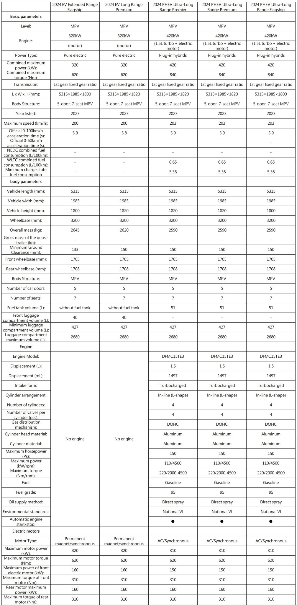 - Range-extended version with a 1.5L turbocharged engine, extending total range to over 1200 km